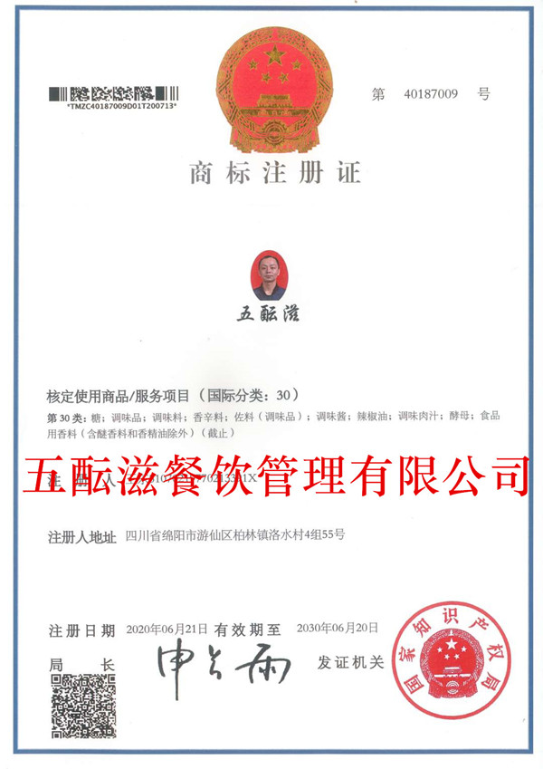 五酝滋30类注册商标证书